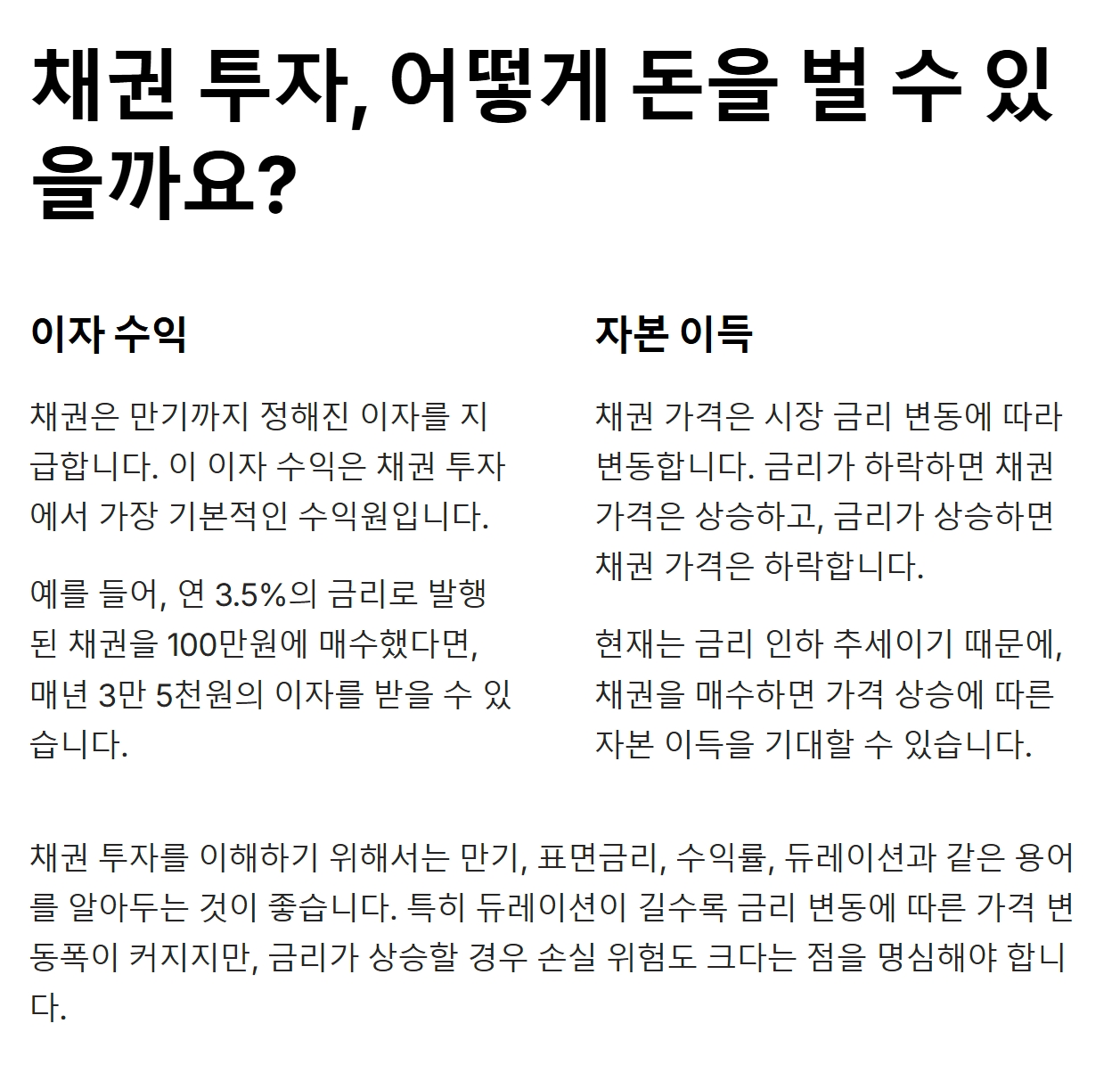 채권 투자 방법은 크게 두 가지입니다. 첫 번째는 이자 수익, 두 번째는 자본 이득입니다.