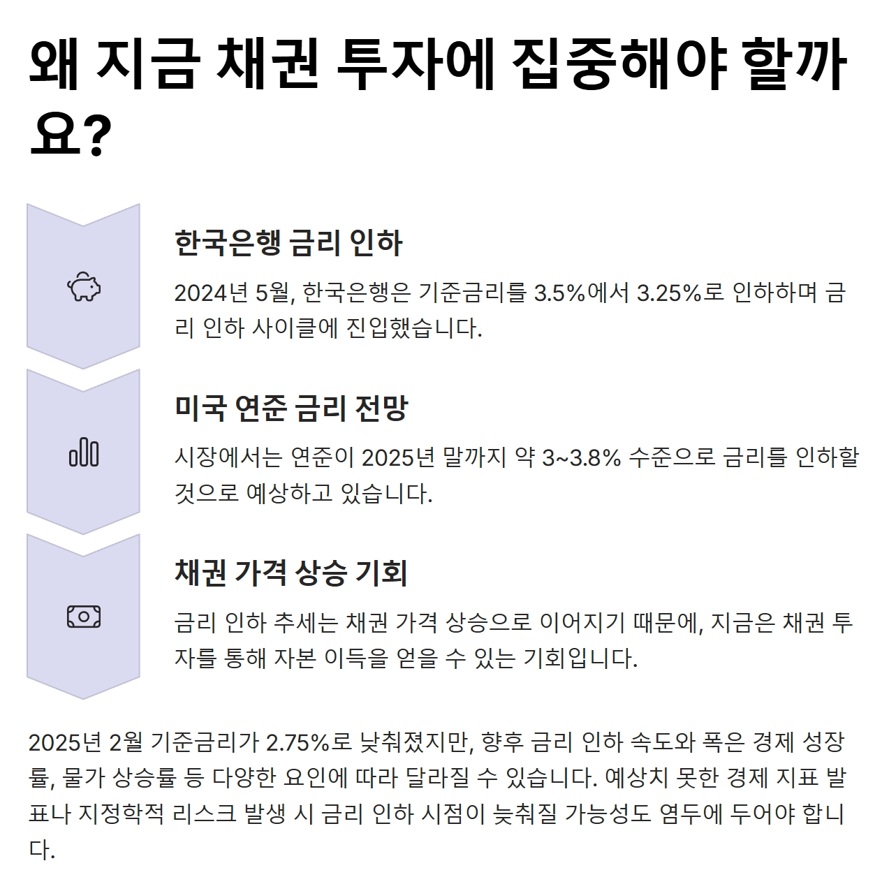 이제 시간이 흘러, 금리 인하 시대가 본격적으로 도래하면서, 채권 투자는 더 이상 선택이 아닌 필수가 되어버렸습니다.