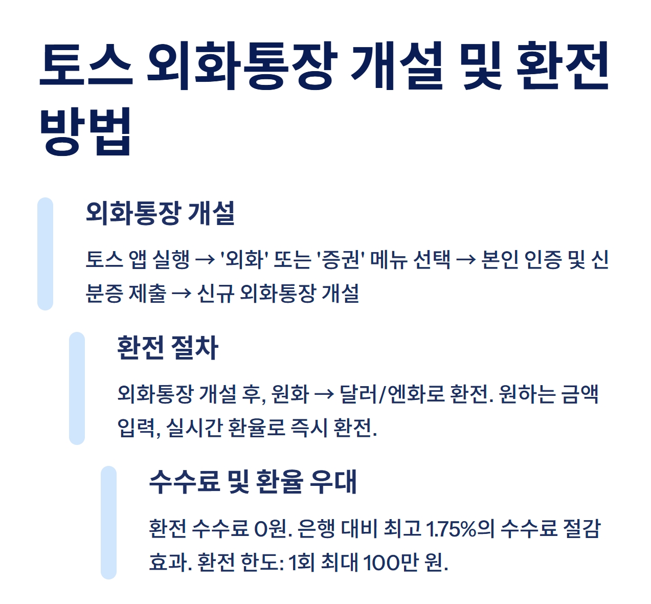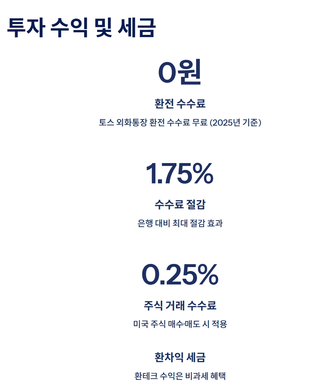 2025년 기준 토스는 달러와 엔화 모두 환전 수수료 0원, 간편한 모바일 환전, 외화통장, 증권 계좌, ETF 투자, 자동매수 기능 등 다양한 글로벌 투자 솔루션을 제공한다.