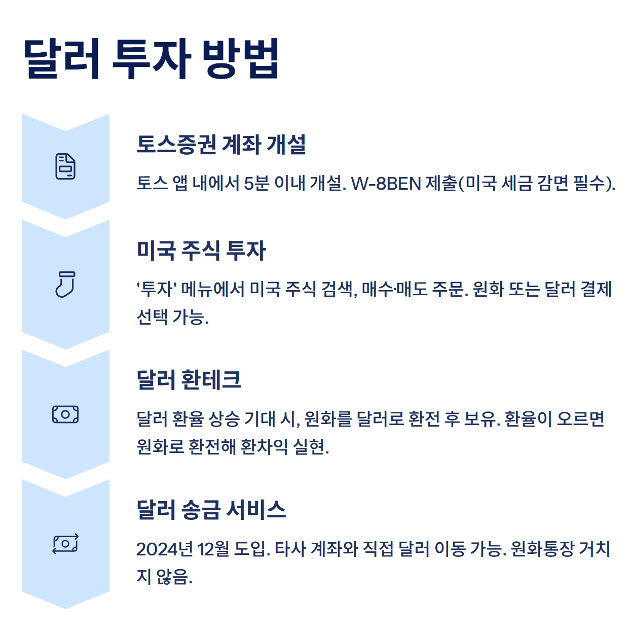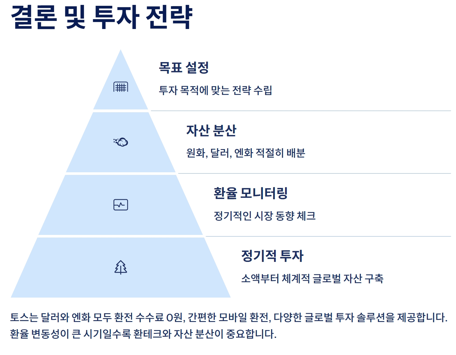 환율 변동성이 큰 시기일수록 환테크와 자산 분산의 중요성이 커지므로, 토스의 외화 서비스를 적극 활용하면 소액부터 체계적인 글로벌 자산 투자가 가능하다.