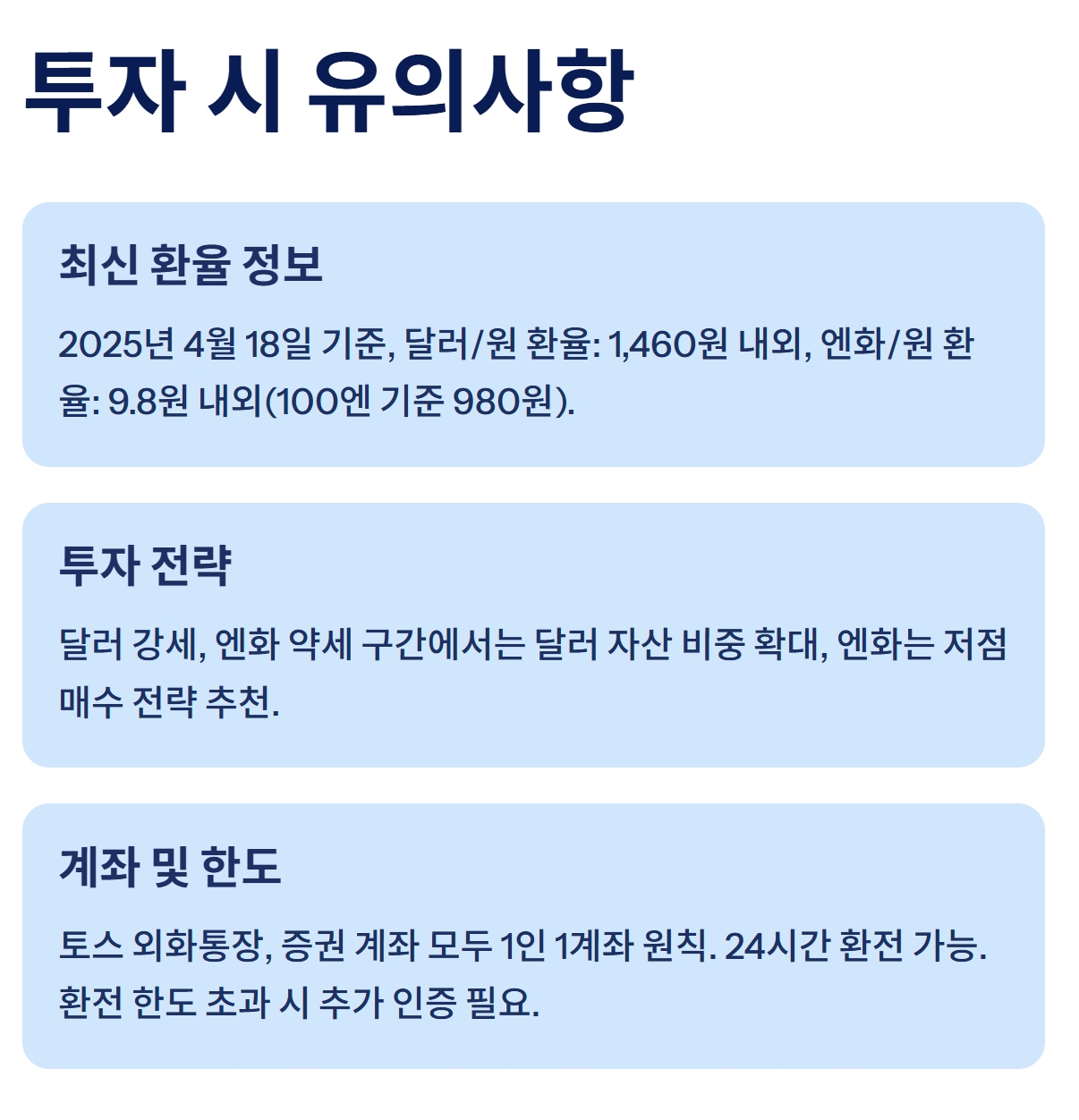 - 2025년 4월 18일 기준, 달러/원 환율: 1,460원 내외, 엔화/원 환율: 9.8원 내외(100엔 기준 980원)