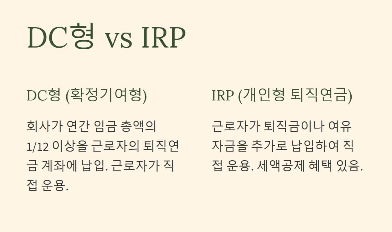 📌 DC형과 IRP 모두 장단점이 있는데요, 자신의 상황에 맞는 제도를 선택하는 것이 중요해요.