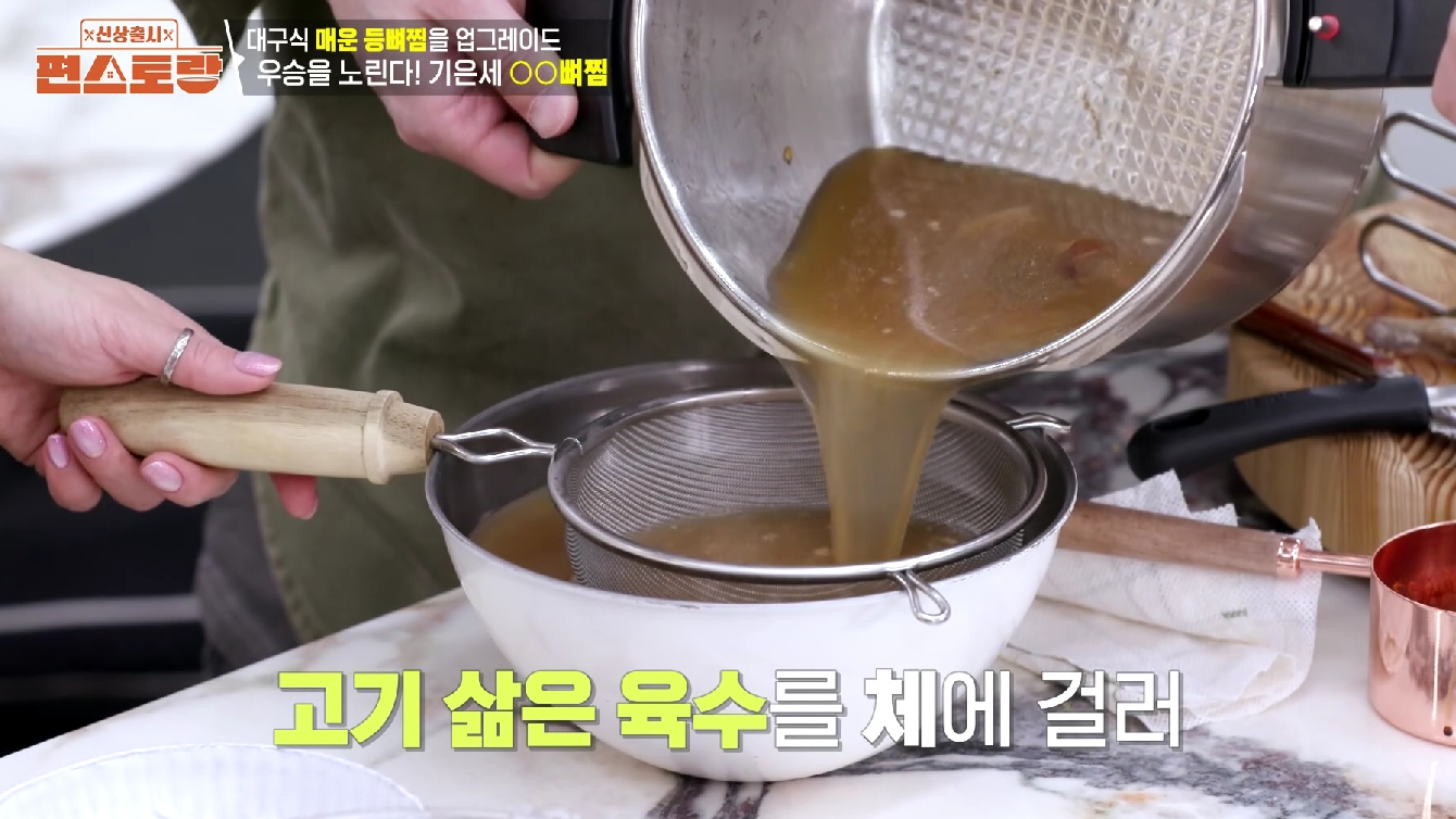 - 고기가 익으면 체에 걸러 육수와 고기를 분리합니다. 이때 육수는 버리지 않고 이후 양념에 사용하니 꼭 따로 보관해야 합니다!