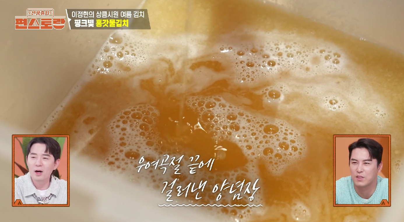 - 마지막으로 [양념장]을 삼베주머니에 넣고 짜듯이 걸러내어 재료 위에 부으면 이정현 홍갓물김치 레시피 완성! 이정현 님의 팁! 삼베주머니에 걸러내면 양념 찌꺼기가 없어 더욱 깔끔한 물김치를 만들 수 있습니다.