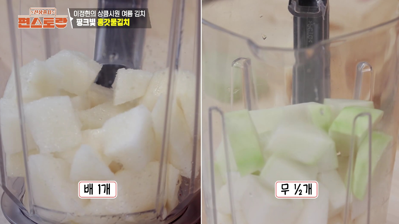 - 믹서기에 배 1개(500g), 무 1/2개(500g), 마늘 3알, 생강 1/3개, 물 300ml를 넣고 곱게 갈아줍니다.