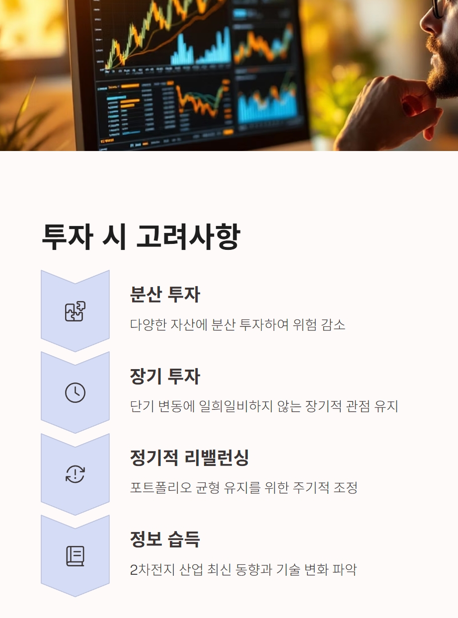 특히, 2차전지 산업은 기술 변화가 빠르고 경쟁이 치열하기 때문에, 투자 환경이 급변할 수 있습니다. 따라서, 투자 시에는 다음과 같은 사항을 고려해야 합니다.