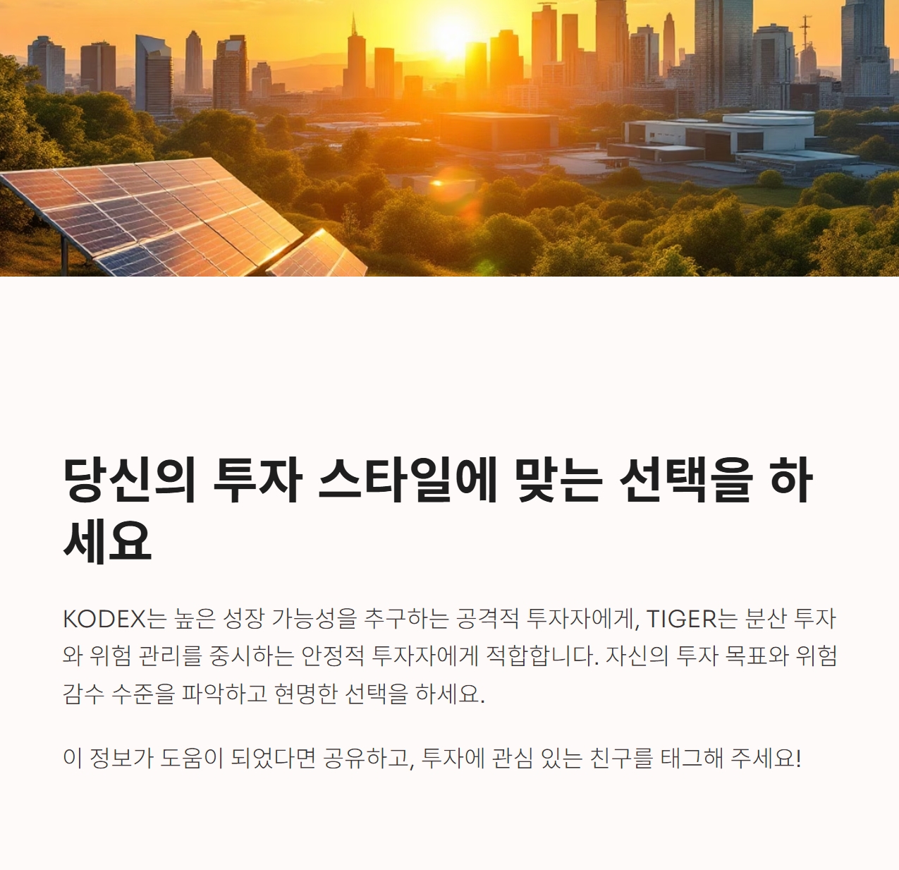 KODEX 2차전지산업 ETF는 높은 성장 가능성을 추구하는 공격적인 투자자에게, TIGER 2차전지테마 ETF는 분산 투자와 위험 관리를 중시하는 안정적인 투자자에게 적합합니다.