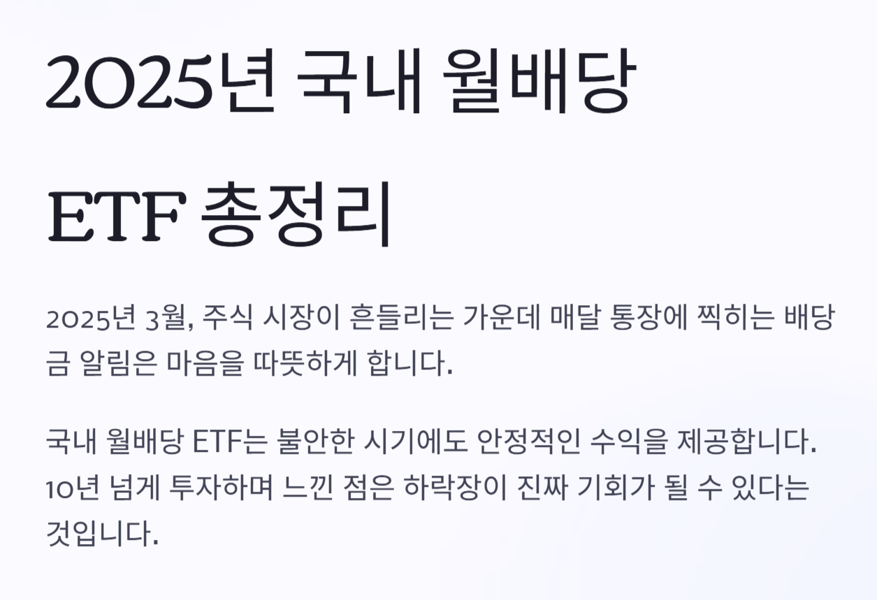 이번에 2025년 3월 기준 국내 월배당 ETF 108개를 꼼꼼히 정리고 국내 월배당 ETF 수익률 TOP 10 종목을 알아보는 시간을 갖도록 하겠습니다.