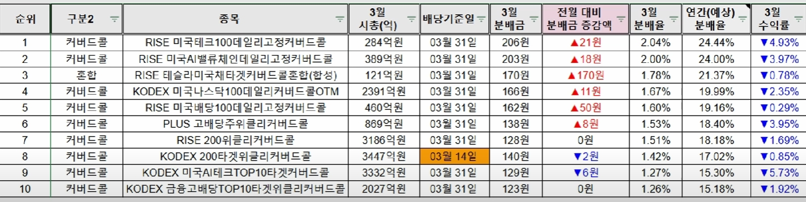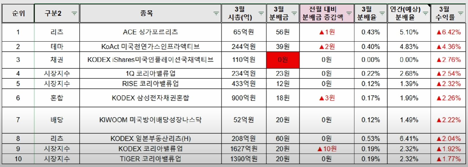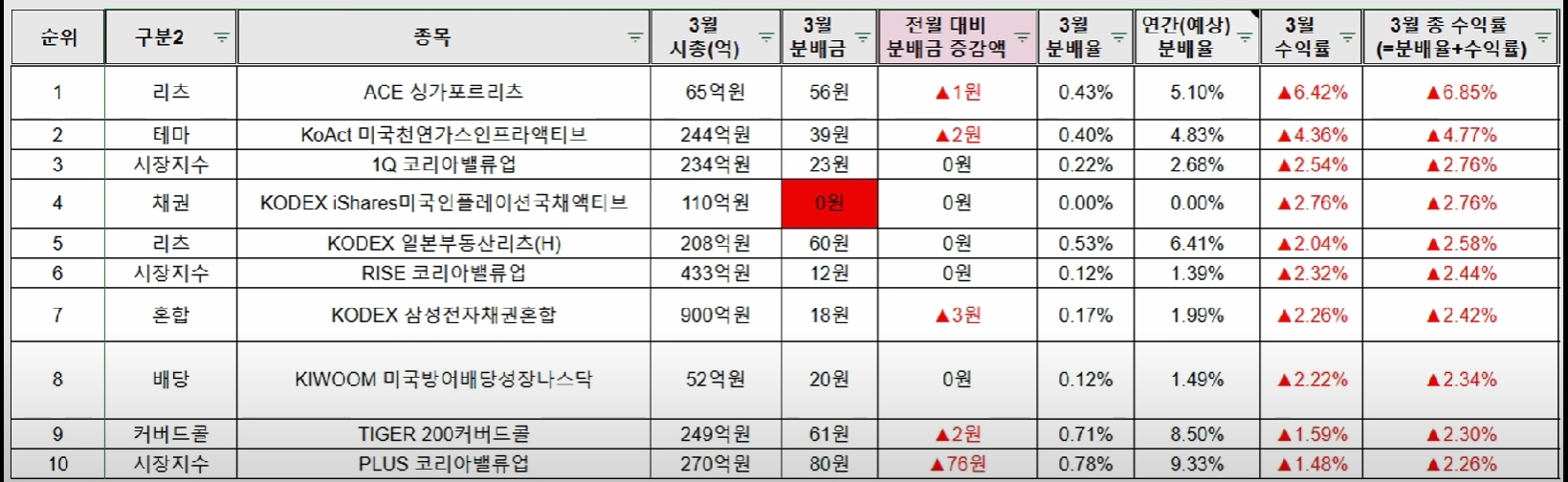 ▼3월 국내 월배당 ETF 분배율 TOP 10