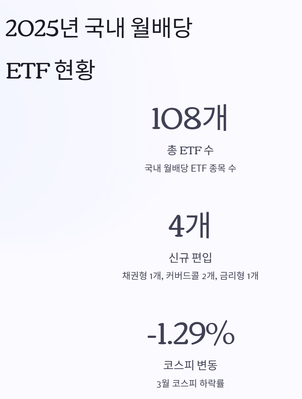 2025년 3월 말 기준, 국내 월배당 ETF는 총 108개로 늘어났습니다. 이번 달에 새로 추가된 4개 종목은 채권형 1개, 커버드콜 2개, 금리형 1개예요.