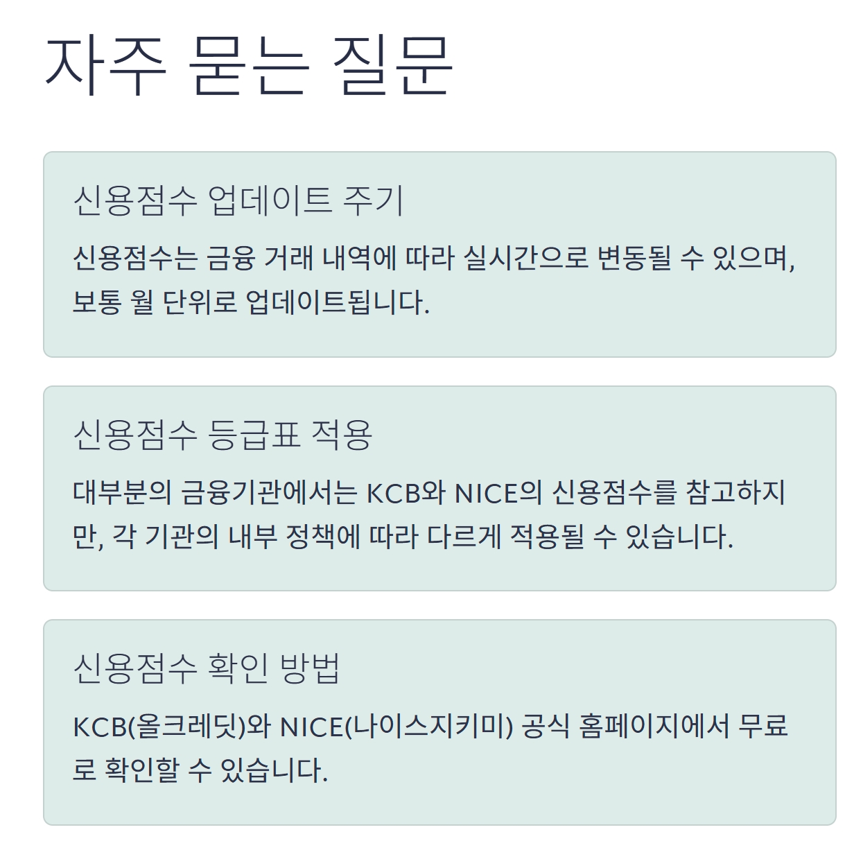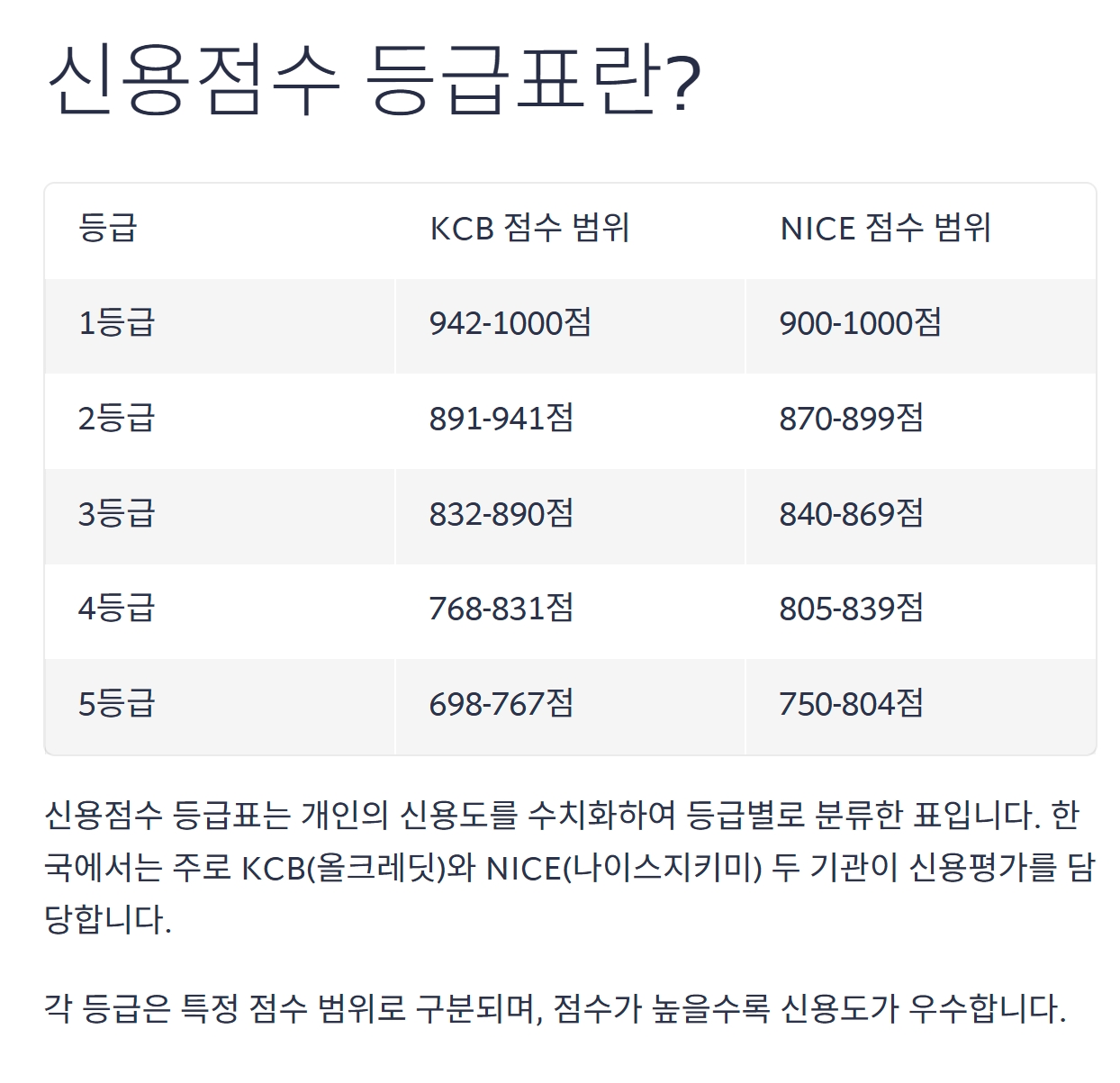 이처럼 각 등급은 특정 점수 범위로 구분되며, 점수가 높을수록 신용도가 우수하다고 평가됩니다.