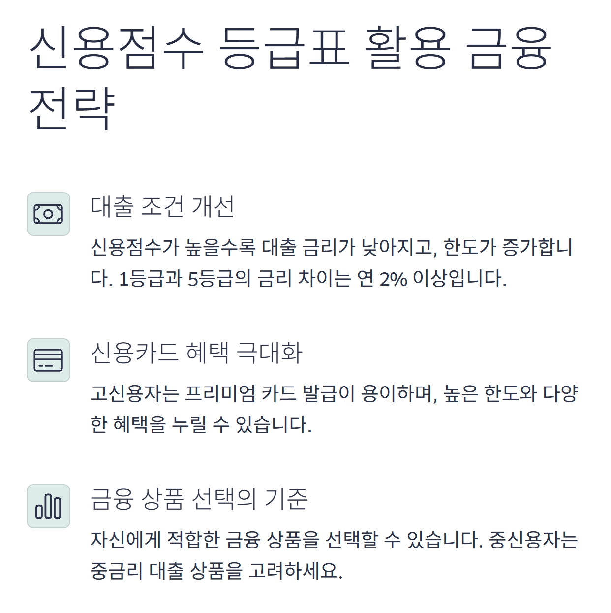 신용점수 등급표를 참고하여, 자신에게 적합한 금융 상품을 선택할 수 있습니다. 예를 들어, 중신용자는 중금리 대출 상품을, 고신용자는 저금리 상품을 우선적으로 고려하는 것이 유리합니다.