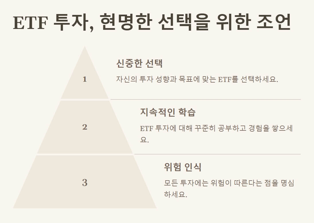 투자를 시작하기 전에 반드시 충분히 공부하고, 자신의 투자 성향과 목표에 맞는 ETF를 신중하게 선택해야 해요.
