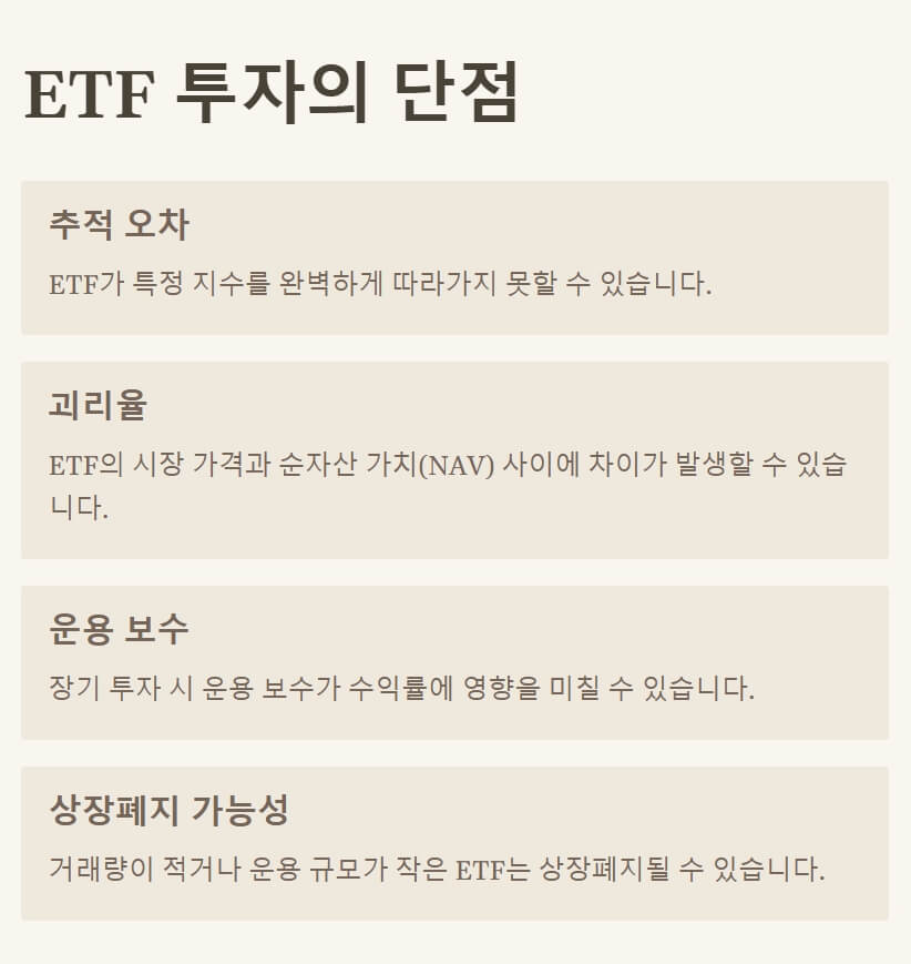 물론, ETF 투자 장단점 분석에서 단점도 빼놓을 수 없겠죠? ETF 투자에도 몇 가지 주의해야 할 점이 있어요.