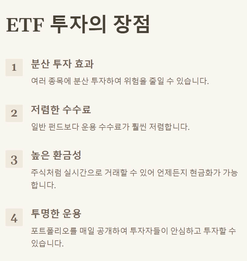 여러 종목에 분산 투자하는 효과도 있고, 펀드보다 수수료도 저렴하고... 여러모로 장점이 많아 보였어요. 물론, 장점만 있는 건 아니겠죠? 😉