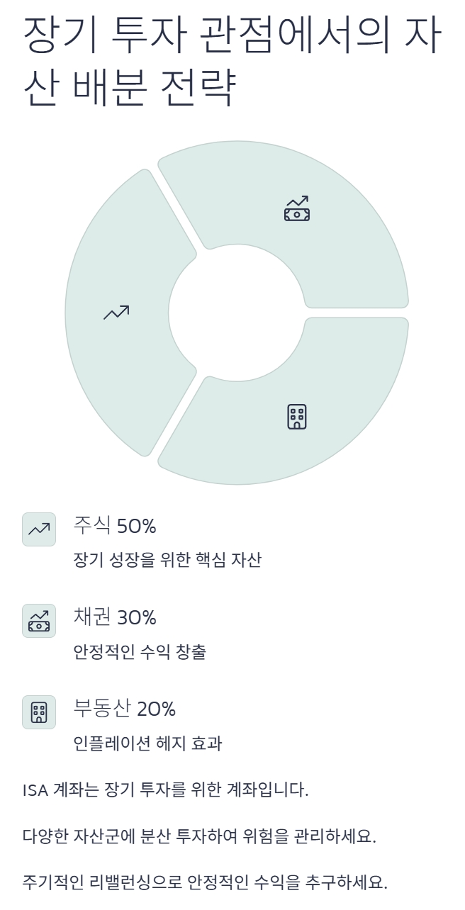 ISA 계좌는 장기 투자를 위한 계좌입니다. 단기적인 시장 변동에 일희일비하지 않고, 장기적인 관점에서 자산 배분 전략을 수립하는 것이 중요합니다.