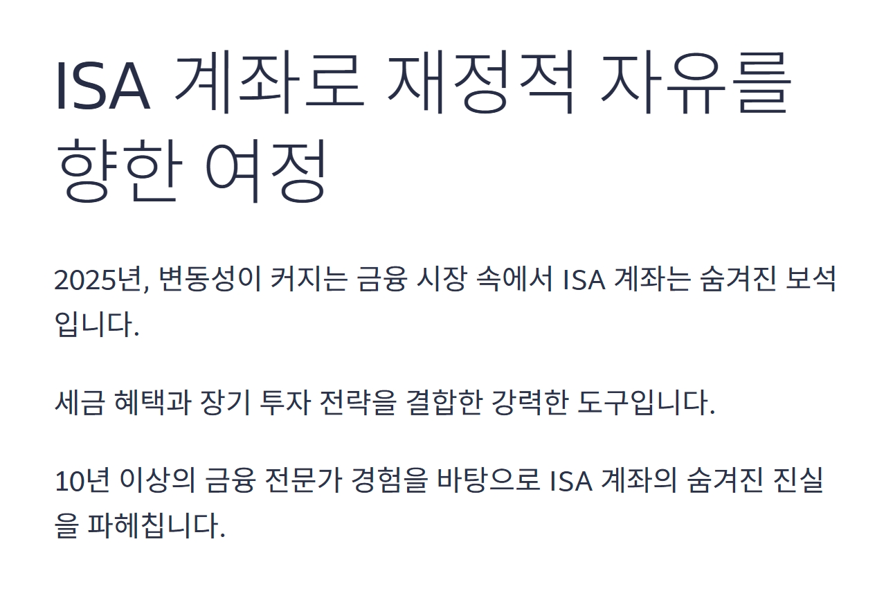 ISA 계좌는 단순히 돈을 모으는 것을 넘어, 세금 혜택과 장기 투자 전략을 결합하여 자산을 불려나갈 수 있는 강력한 도구입니다.