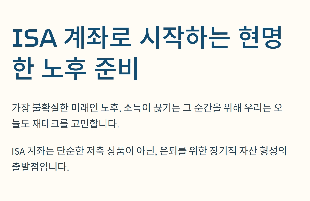 ISA 계좌(개인종합자산관리계좌)는 단순한 저축 상품이 아닌, 은퇴를 위한 장기적 자산 형성의 출발점입니다.